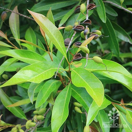 Ornamental native tree with dark glossy leaves and long white scented flower spikes which cascade downward. Very popular subtropical street tree, robust, shapely, eyecatching in full flowers; and enjoyed by birds and beneficial pollinators. You can make a bushtucker drink from the nectar-rich flowers, as Bridgette on our packing team did – see the photos!