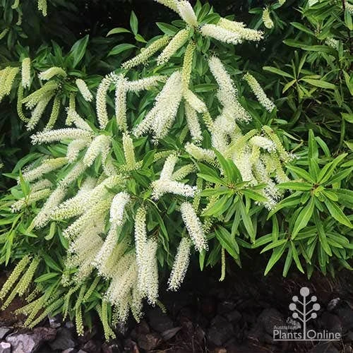 APPEARANCE : Ornamental native tree with dark glossy leaves and abundant long white grevillea-like scented flower spikes which cascade downward. Trees will sometimes flower on one side first.
