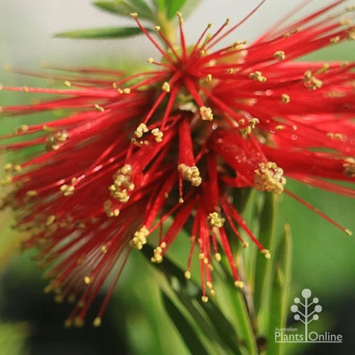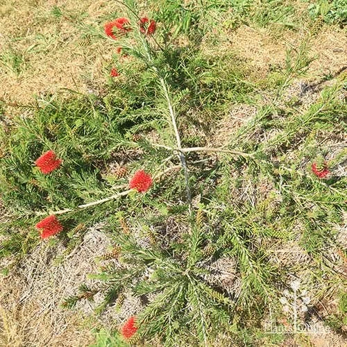 DESCRIPTION: A compact branching groundcover callistemon with neat form and fine stiff almost-spiny foliage which emerges in pale pink fluffy tufts. Large brilliant red brush flowers spangled with gold appear in spring. The parent form is indigenous to the Blackdown Tablelands of north Queensland
