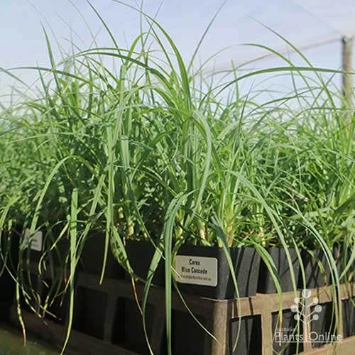 APPEARANCE: Compact form of this blue-green sedge grass. Lower growing, with long slender arching leaves, bluish green in colour.